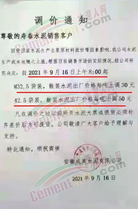 安徽成美水泥有限公司通知因受目前水泥生產(chǎn)主要原材料漲價等因素影響,公司水泥生產(chǎn)成本也隨之上漲,根據(jù)目前銷售市場實際情況,經(jīng)公司研究決定9月16日8時起,上調(diào)M32.5水泥價格30元/噸,42.5水泥出廠價上調(diào)50元/噸。