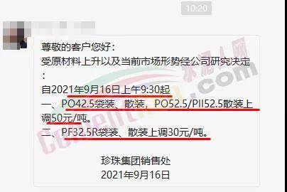 珍珠集團銷售處通知,自9月16日起各標號水泥上調(diào)30-50元/噸。