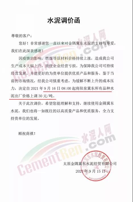 同期山西太原金隅冀東水泥經(jīng)貿(mào)有限公司通知,因疫情的影響,燃煤等原材料價格持續(xù)上漲,造成公司生產(chǎn)成本大幅上升,致使企業(yè)經(jīng)營虧損。為保障公司可持續(xù)經(jīng)營發(fā)展,并能更好的為貴單位提供優(yōu)質(zhì)產(chǎn)品和服務(wù)。鑒于當前的市場情況,經(jīng)公司慎重考慮,為緩解不斷上升的成本壓力,決定自2021年9月16日08∶00起將陽泉冀東所有品種水泥出廠價格上調(diào)30元/噸。