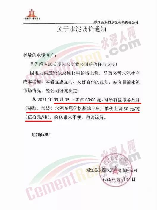 云南省昭通市綏江縣永固水泥有限責任公司通知因電力供應(yīng)緊缺及原材料價格上漲,導(dǎo)致公司水泥生產(chǎn)成本增加,結(jié)合目前水泥市場情況,經(jīng)公司研究決定從2021年9月15日0時起,對所有區(qū)域各品種(袋裝、散裝)水泥在原價格基礎(chǔ)上出廠單價上調(diào)50元/噸。