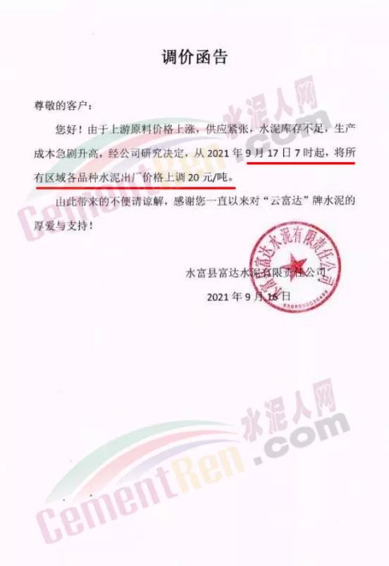 廣西壯族自治區(qū)桂林市水富縣富達水泥公司通知,由于上游原料價格上漲,供應(yīng)緊張,水泥庫存不足,生產(chǎn)成本急劇升高,經(jīng)公司研究決定,從2021年9月17日7時起,將所有區(qū)域各品種水泥出廠價格上調(diào)20元/噸。
