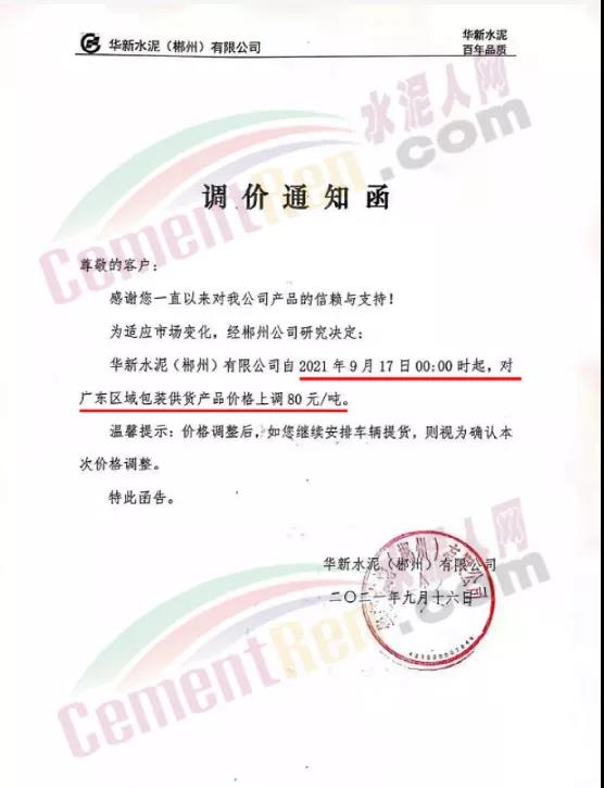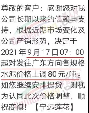 同日寧遠蓮花水泥通知自9月17日7時起對發(fā)往廣東方向各規(guī)格水泥上調(diào)80元/噸。