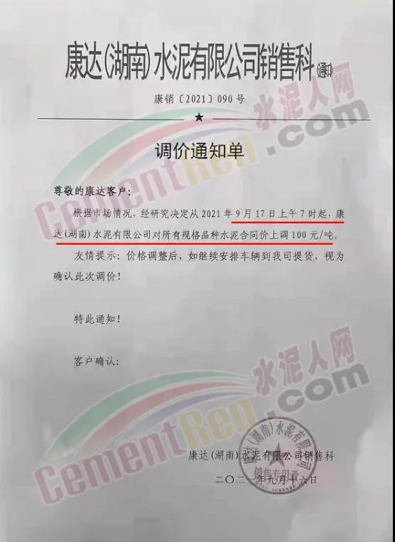 康達(湖南)水泥有限公司繼15日上調(diào)50元/噸后,再次通知9月17日7時起,公司所有規(guī)格品種水泥價格上調(diào)100元/噸。兩日內(nèi)上調(diào)150元/噸。