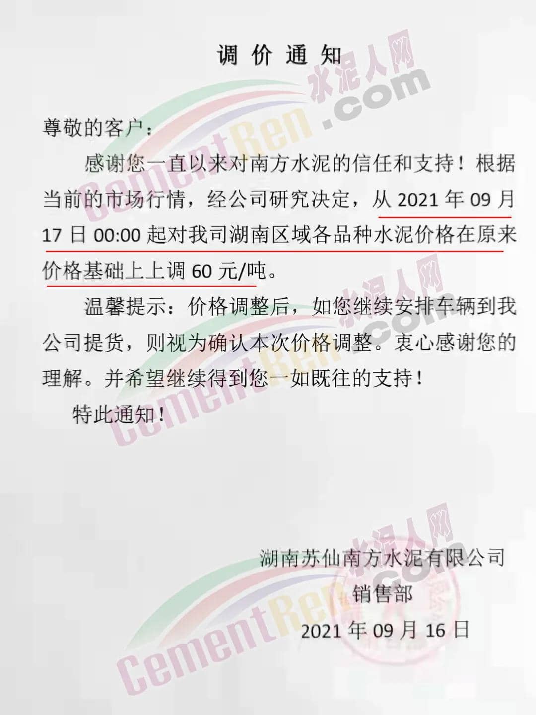 湖南蘇仙南方水泥通知,從9月17日0時對湖南區(qū)域各品種水泥價格上調(diào)60元/噸。