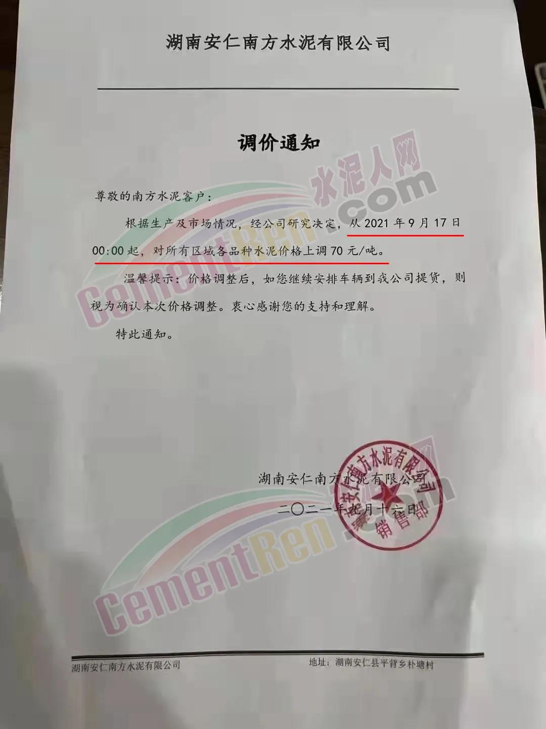 湖南安仁南方通知,9月17日起對所有區(qū)域各品種水泥價格上調(diào)70元/噸。