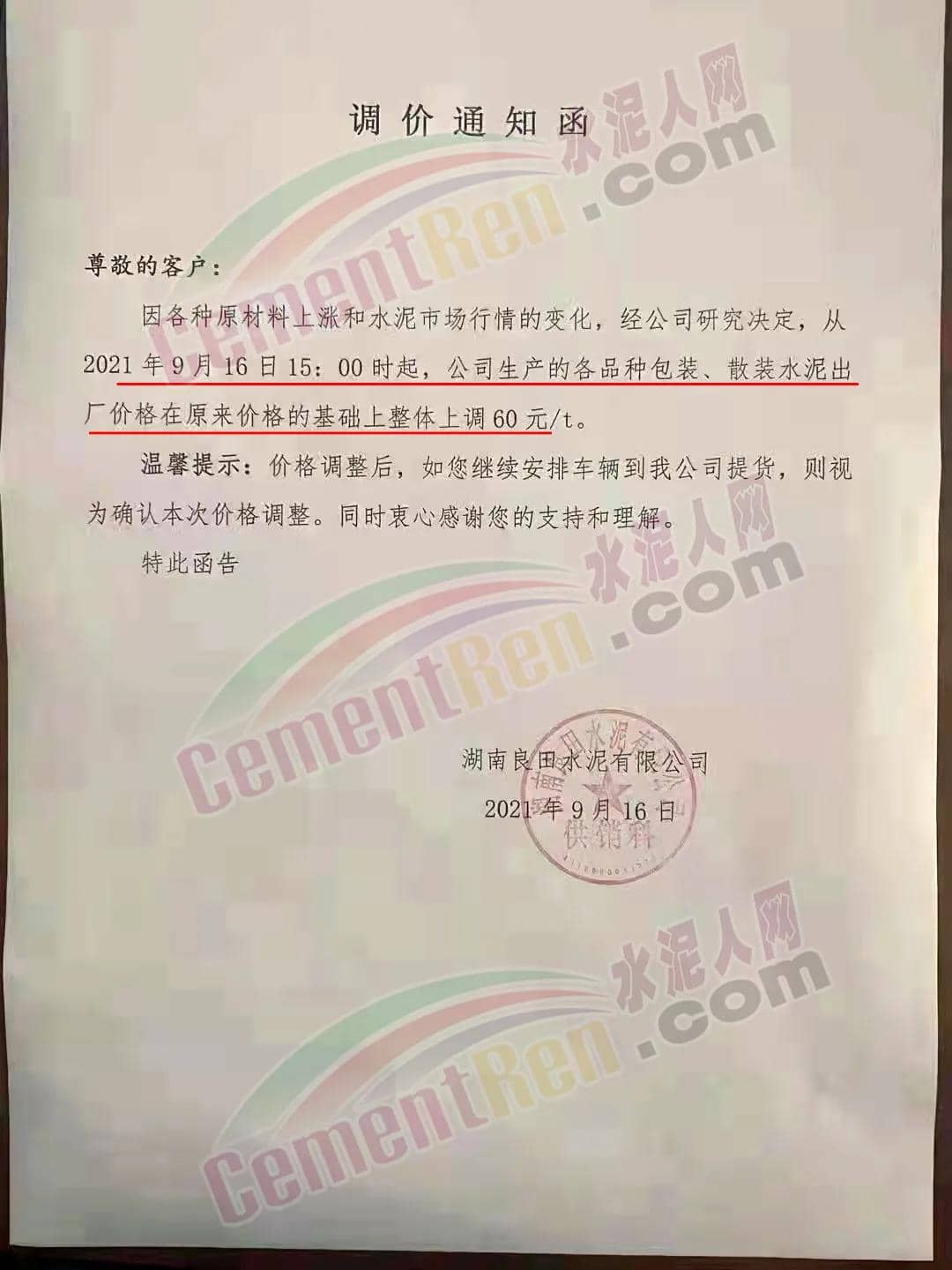 湖南良田水泥有限公司通知,自9月16日15時起,公司各品種水泥上調(diào)60元/噸。