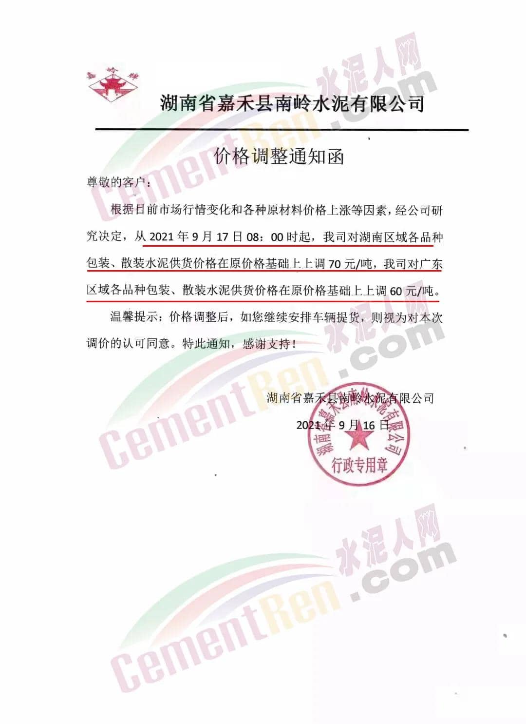 湖南嘉禾縣南嶺水泥有限公司通知,自9月17日8時起,公司對湖南區(qū)域各品種水泥上調(diào)70元/噸,對廣東地區(qū)各標號水泥上調(diào)60元/噸。