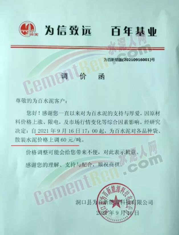 洞口縣為百水泥通知,因原材料價格上漲、限電及市場行情變化等綜合因素影響,經(jīng)研究決定自9月16日17時起,為百水泥各品種袋裝、散裝水泥價格上調(diào)60元/噸。