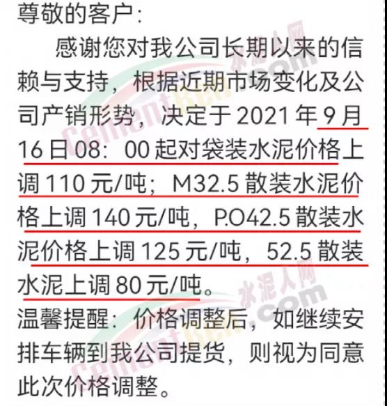9月16日,江華海螺通知稱再次上調(diào)M32.5散裝水泥直漲140元/噸,PO42.5散裝水泥直漲125元/噸,包裝水泥上調(diào)110元/噸,52.5散裝水泥上調(diào)80元/噸。