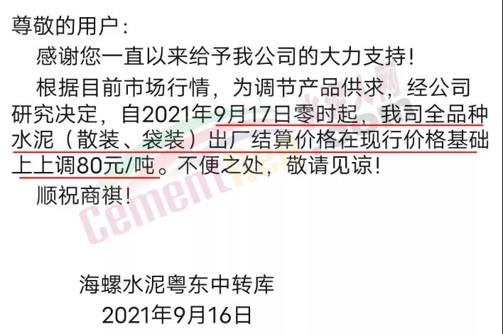 海螺水泥粵東中轉(zhuǎn)庫通知根據(jù)目前市場行情,為調(diào)節(jié)產(chǎn)品供求,經(jīng)公司研究決定,自2021年9月17日零時起,公司全品種水泥(散裝、袋裝)出廠結(jié)算價格在現(xiàn)行價格基礎(chǔ)上上調(diào)80元/噸。