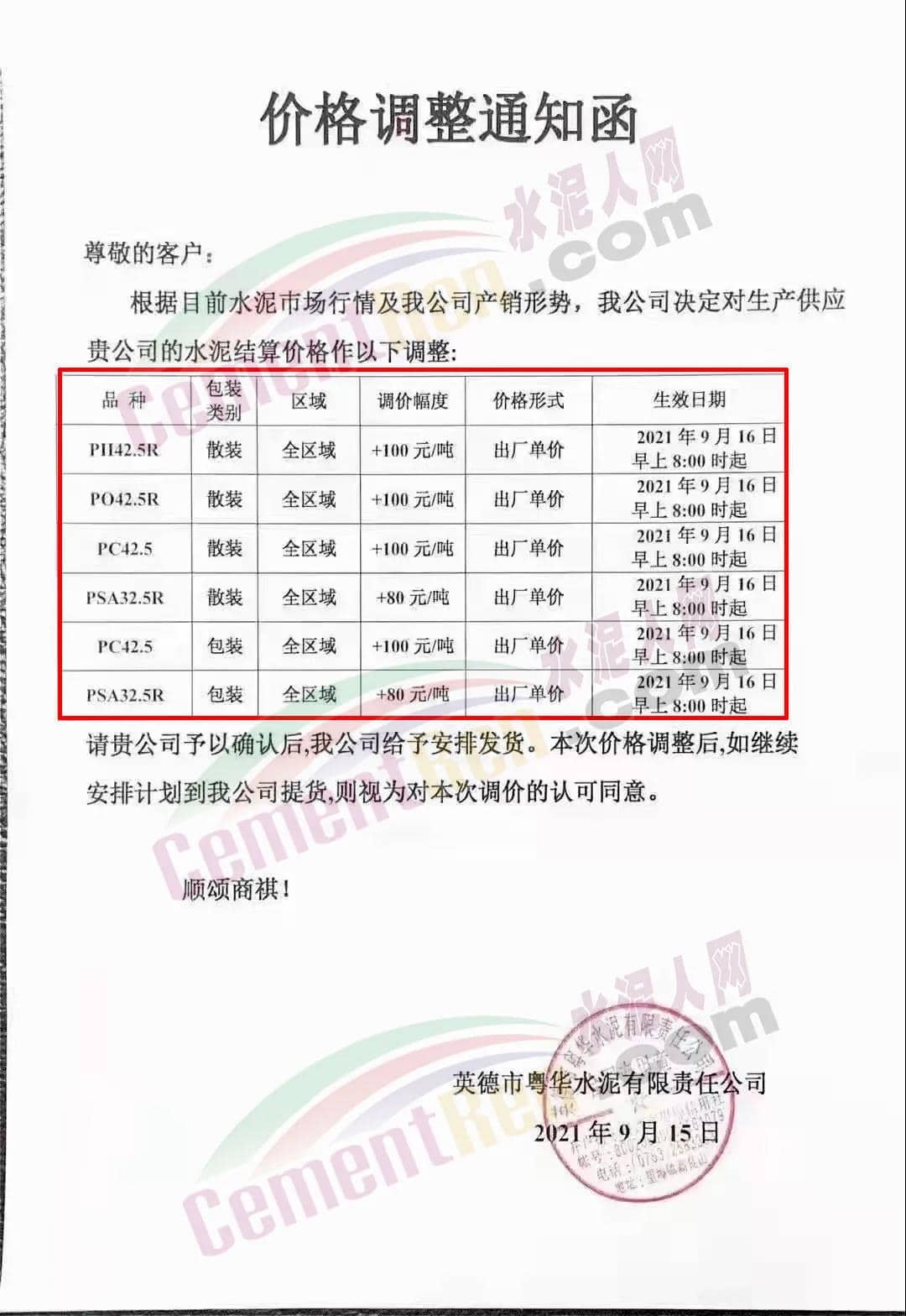 英德市粵華水泥有限責任公司通知,自9月16日早上8時起,各標號水泥上調(diào)80-100元/噸。
