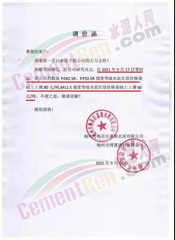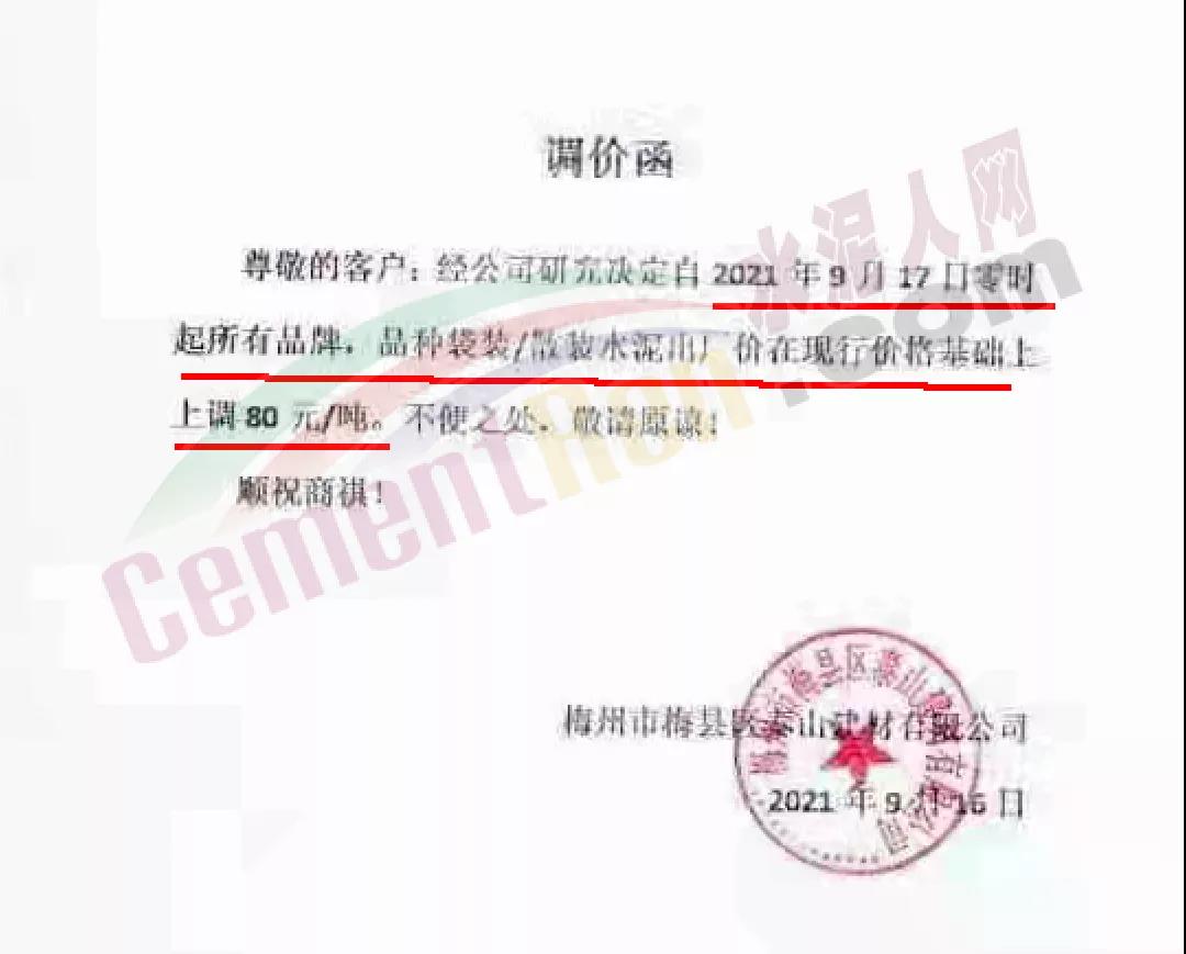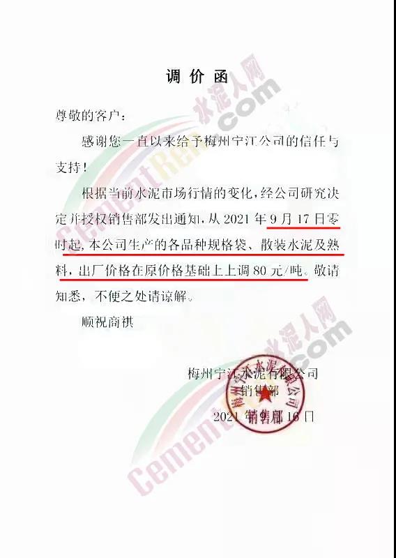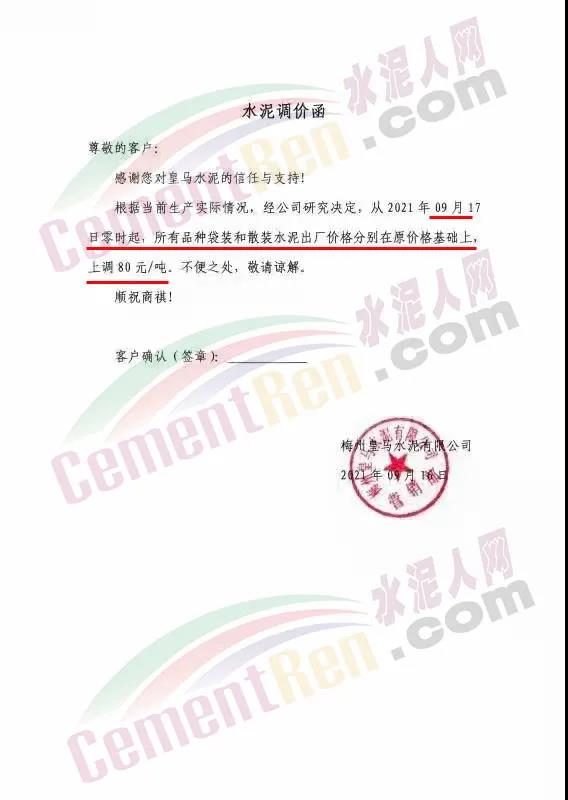 梅州皇馬水泥有限公司通知,9月17日零時起,各品種水泥價格上調(diào)80元/噸。