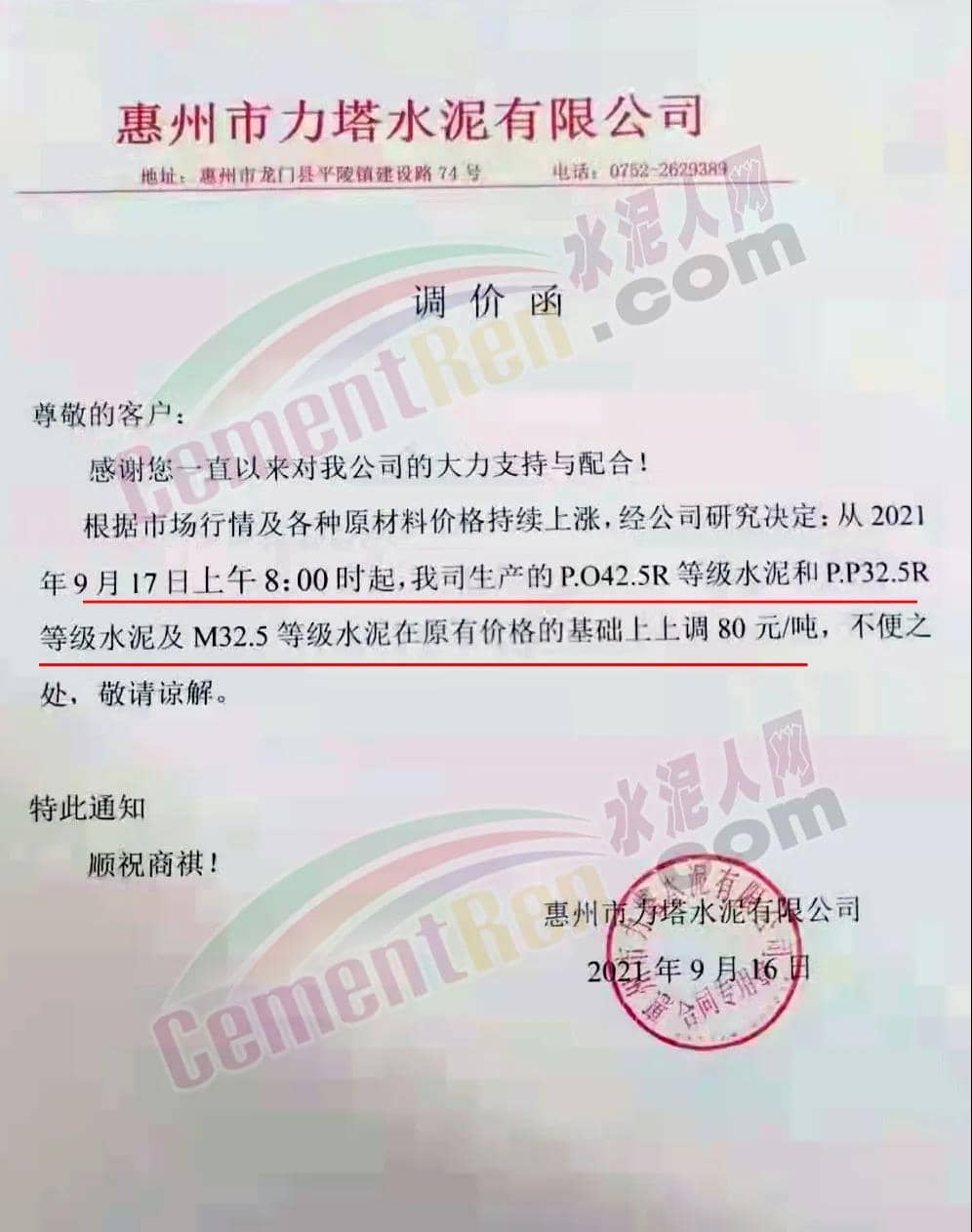 惠州市力塔水泥通知,根據(jù)市場行情 及各種原材料價格持續(xù)上漲,經(jīng)公司研究決定,從2021年9月17日上午8時起,公司生產(chǎn)的各標號水泥上調(diào)80元/噸。