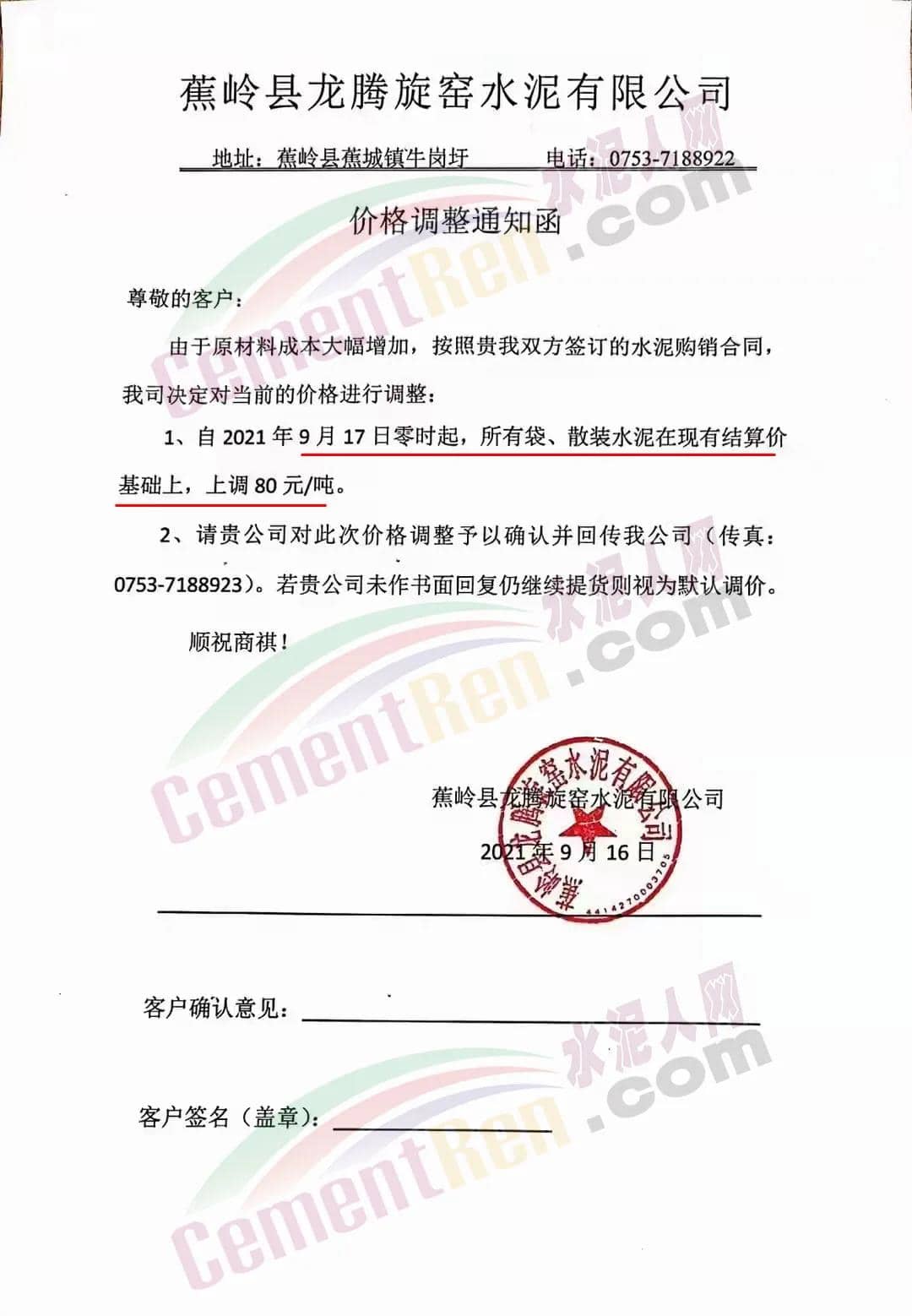 蕉嶺縣龍騰旋窯水泥有限公司通知9月17日零時起,所有袋裝、散裝水泥價格上調(diào)80元/噸。