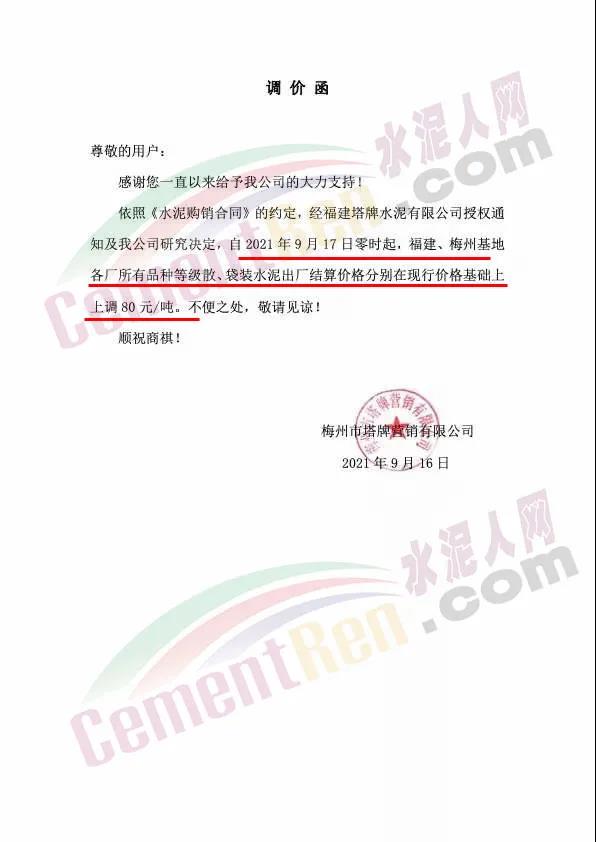 梅州市塔牌營銷有限公司通知,9月17日零時起,福建、梅州基地各廠所有品種等級散、袋裝水泥出廠結(jié)算價上調(diào)80元/噸。