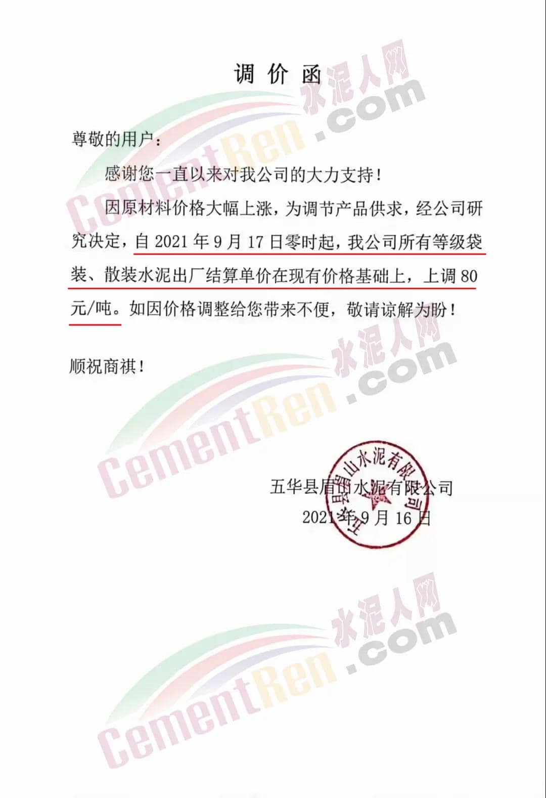 五華縣眉山水泥有限公司通知自9月17日零時起,公司所有等級水泥價格上調(diào)80元/噸。