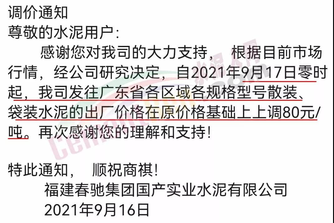 福建春馳集團國產(chǎn)實業(yè)水泥通知,9月17日零時起,公司發(fā)往廣東各區(qū)域各規(guī)格水泥上調(diào)80元/噸。
