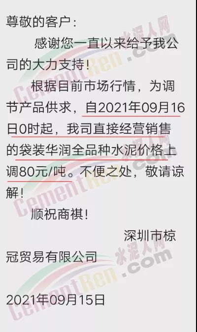 深圳市椋冠貿(mào)易有限公司通知,9月16日起,公司直接經(jīng)營銷售的袋裝華潤全品種水泥價格上調(diào)80元/噸。
