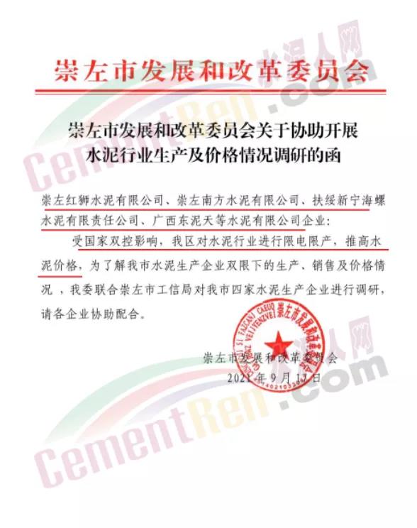 近日,崇左市發(fā)改委發(fā)調(diào)研函給轄區(qū)內(nèi)紅獅、南方、海螺、東泥天等等水泥企業(yè)稱,受?chē)?guó)家雙控影響,廣西壯族自治區(qū)對(duì)水泥行業(yè)進(jìn)行限電限產(chǎn),推高水泥價(jià)格,為了解崇左市水泥企業(yè)雙限下的生產(chǎn)、銷售及價(jià)格情況,崇左市發(fā)改委聯(lián)合崇左市工信局將對(duì)區(qū)域內(nèi)四家水泥生產(chǎn)企業(yè)進(jìn)行調(diào)研。