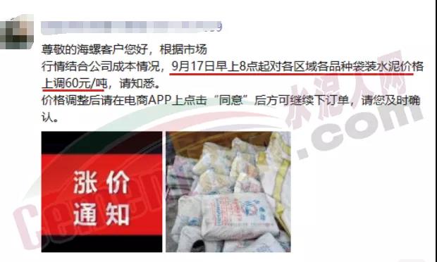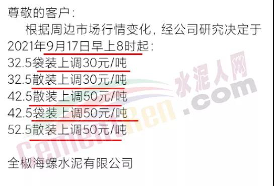 湖南地區(qū)雙峰海螺、漣源海螺、邵陽(yáng)海螺通知自9月17日起,對(duì)所有區(qū)域各品種水泥出廠價(jià)上調(diào)60元/噸。