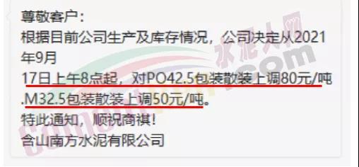 同日,含山南方水泥有限公司通知根據(jù)目前公司生產(chǎn)及庫(kù)存情況,公司決定從2021年9月17日上午8點(diǎn)起,對(duì)PO42.5包裝散裝上調(diào)80元/噸。M32.5包裝散裝上調(diào)50元/噸。