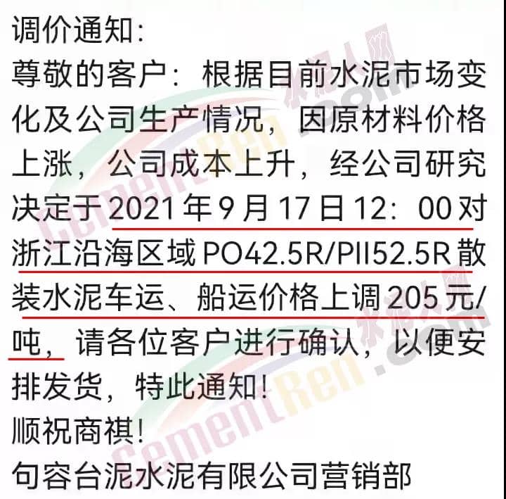 句容臺(tái)泥水泥有限公司通知稱,根據(jù)目前水泥市場(chǎng)變化及公司生產(chǎn)情況,因原材料價(jià)格上漲,公司成本上升,經(jīng)公司研究決定于2021年9月17日12時(shí)對(duì)浙江沿海區(qū)域PO42.5R/PII52.5R散裝水泥車(chē)運(yùn)、船運(yùn)價(jià)格上調(diào)205元/噸,創(chuàng)造了近年來(lái)單次漲價(jià)最高紀(jì)錄。