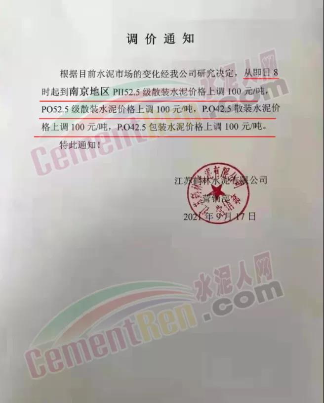 江蘇鶴林水泥有限公司通知,從17日8時(shí)起南京地區(qū)各標(biāo)號(hào)水泥上調(diào)100元/噸。