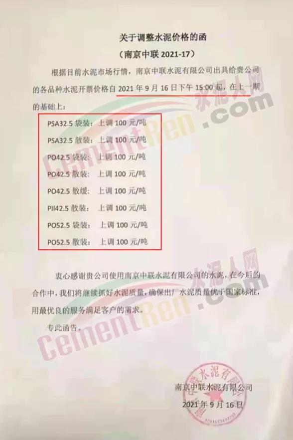 南京中聯(lián)水泥有限公司通知,根據(jù)目前水泥市場(chǎng)行情,自9月16日下午15時(shí)起各標(biāo)號(hào)水泥上調(diào)100元/噸。
