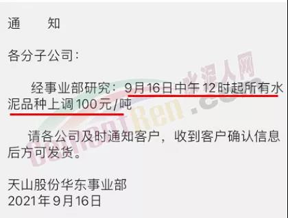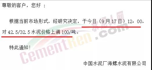 天山股份華東事業(yè)部通知,9月16日中午12時(shí)起所有水泥品種上調(diào)100元/噸。