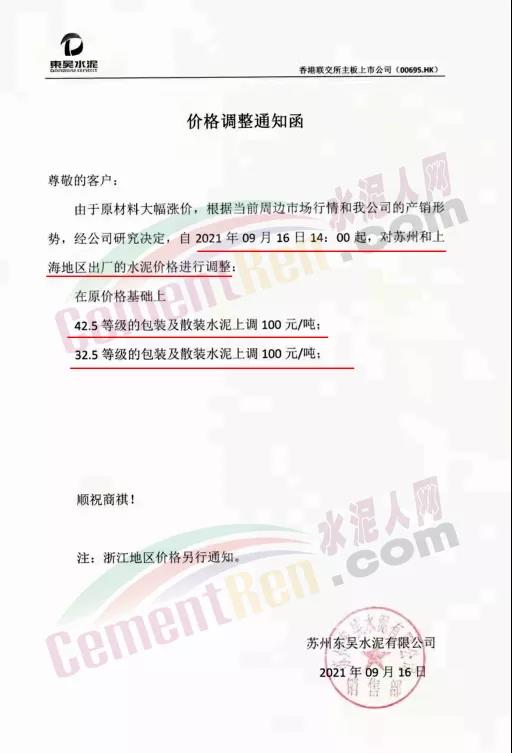 東吳水泥通知,由于原材料大幅漲價(jià),根據(jù)當(dāng)前周邊市場(chǎng)行情及公司的產(chǎn)銷形勢(shì),自9月16日14時(shí)起,對(duì)蘇州和上海地區(qū)的出廠水泥價(jià)格上調(diào)100元/噸。