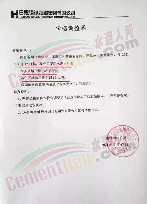 日照鋼鐵控股集團(tuán)通知,自9月17日起公司蒙陰水泥出廠價(jià),江蘇區(qū)域上調(diào)105元/噸,其他區(qū)域出廠價(jià)上調(diào)60元/噸。