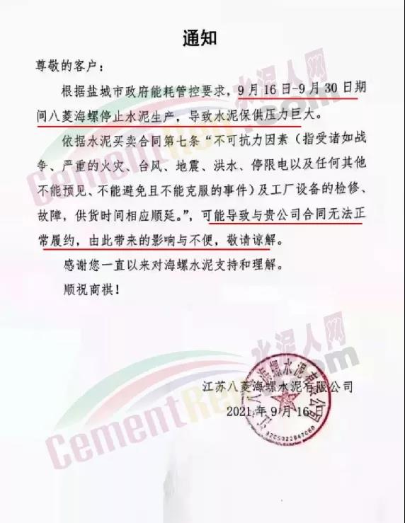 據(jù)水泥人網(wǎng)此前消息,9月16日八菱海螺發(fā)通知稱,根據(jù)江蘇省鹽城市政府能耗管控要求,9月16日-9月30日期間八菱海螺停止水泥生產(chǎn),導(dǎo)致水泥保供壓力巨大。不可抗力因素可能導(dǎo)致與貴公司合同無(wú)法正常履約。