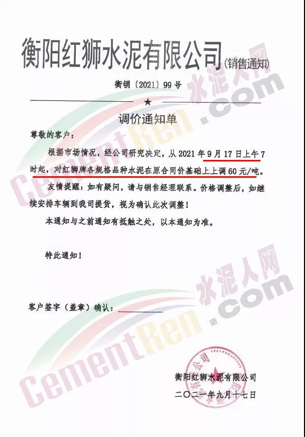 衡陽(yáng)紅獅水泥通知,自9月17日上午7時(shí)起上調(diào)各規(guī)格品種水泥價(jià)格60元/噸。