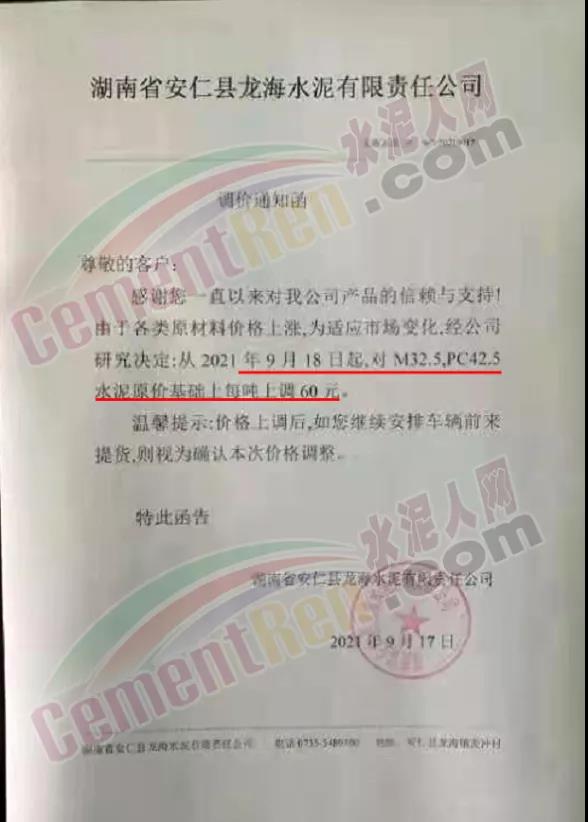 湖南省安仁縣龍海水泥有限責(zé)任公司通知,自9月18日起,上調(diào)水泥價(jià)格60元/噸。