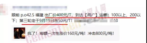 福建地區(qū)經(jīng)銷商通知稱,目前P.O42.5散裝水泥出廠價(jià)400元/噸,到達(dá)兩廣運(yùn)費(fèi)100-200元以下,并預(yù)告稱第三輪漲價(jià)定于9月19日漲50元/噸。