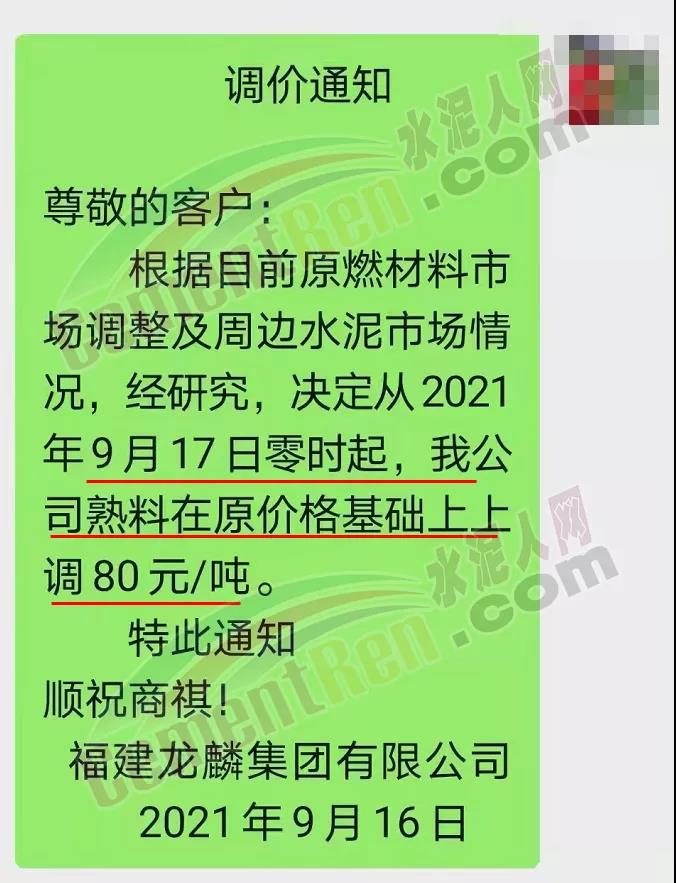 福建龍麟集團(tuán)通知,9月17日零時(shí)起,公司熟料在原價(jià)基礎(chǔ)上上調(diào)80元/噸。