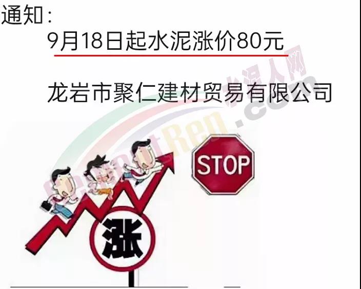 龍巖市聚仁建材貿(mào)易有限公司通知,9月18日起水泥漲價(jià)80元/噸。