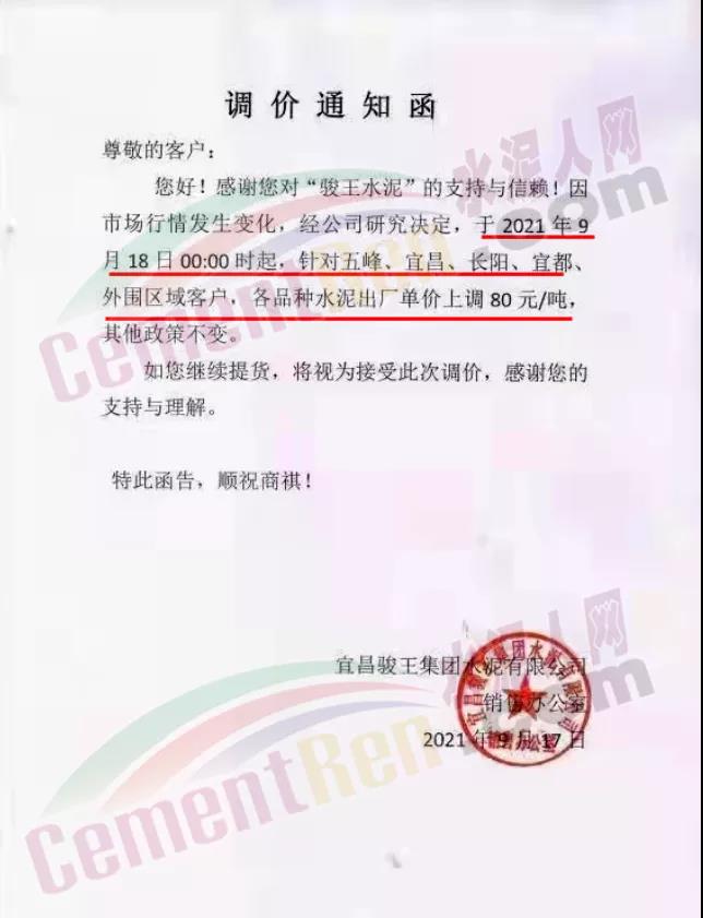 湖北宜昌駿王集團(tuán)通知9月18日0時(shí)起,針對(duì)五峰、宜昌、長(zhǎng)陽(yáng)、宜都外圍區(qū)域客戶,各品種水泥出廠單位上調(diào)80元/噸。