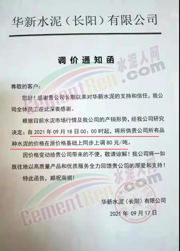 華新水泥(長(zhǎng)陽(yáng))有限公司9月18日0時(shí)起上調(diào)各品種水泥價(jià)格80元/噸。