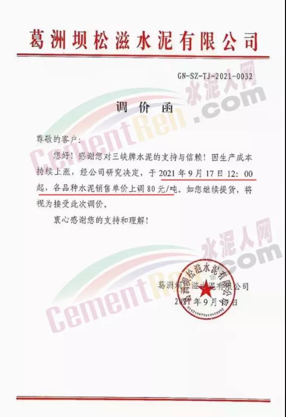 葛洲壩松滋水泥有限公司通知因生產(chǎn)成本持續(xù)上漲,于9月17日12時(shí)上調(diào)各標(biāo)號(hào)水泥價(jià)格80元/噸。