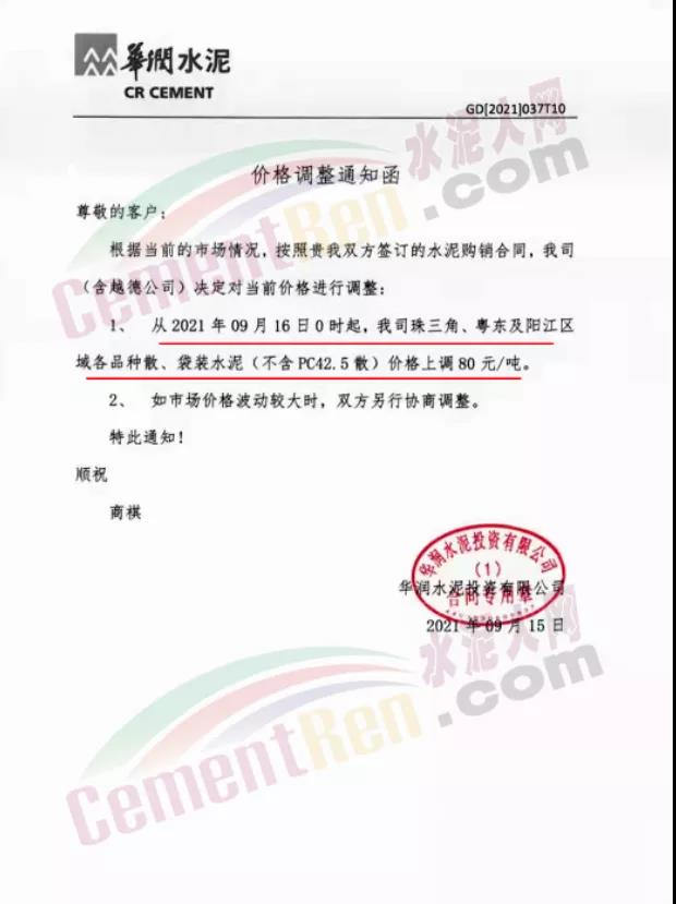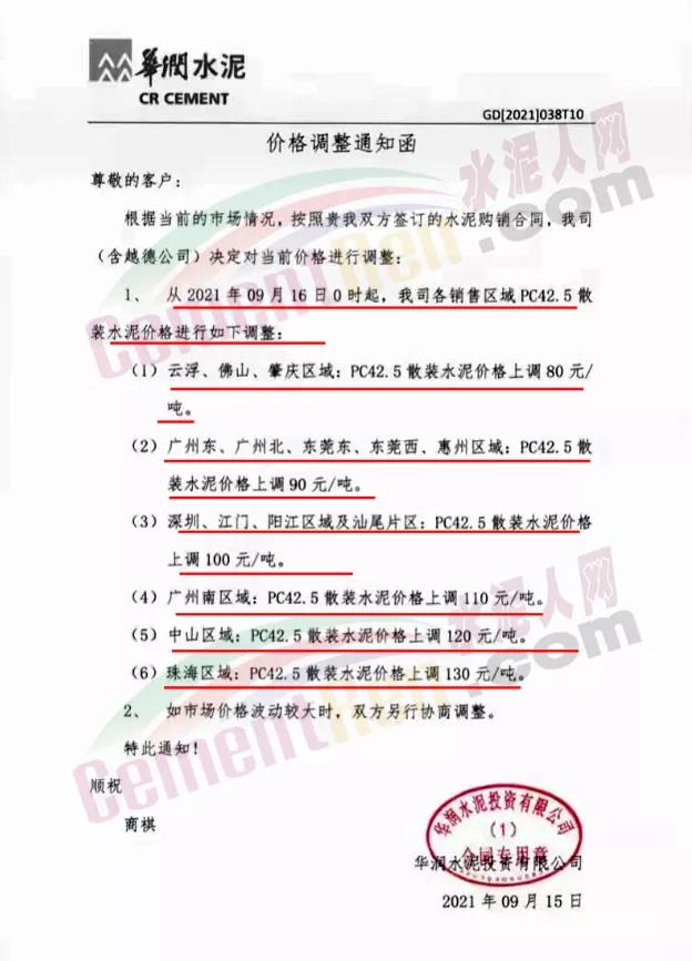 華潤(rùn)水泥通知,根據(jù)當(dāng)前的市場(chǎng)情況,公司(含越德公司)從2021年9月16日0時(shí)起,珠三角、粵東及陽(yáng)江區(qū)域各品種散、袋裝水泥(不含PC42.5散)價(jià)格上調(diào) 80元/噸。