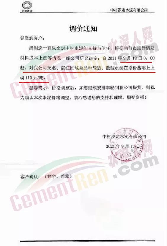 中材羅定水泥有限公司通知,自9月18日0時(shí)起,公司茂名、湛江區(qū)域全品種水泥上調(diào)110元/噸。