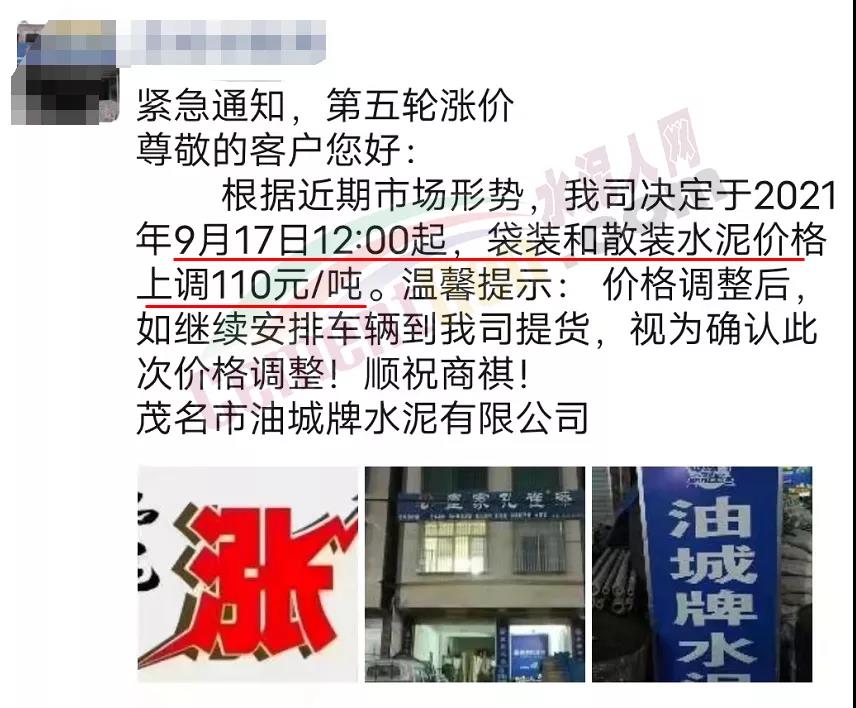 17日一早,經(jīng)銷商便發(fā)消息提示,“龍頭企業(yè)領(lǐng)漲,市場(chǎng)價(jià)格一日一變,水泥廠限電,水泥供應(yīng)緊張,但是這個(gè)價(jià)格似乎有些逆天了,誰(shuí)也不敢大批量的進(jìn)貨,市場(chǎng)是亂的,價(jià)格是亂的,不知道漲了幾輪,也不知道該怎么報(bào)價(jià),早晨還五百多的價(jià)格,傍晚就七百元一噸了。”