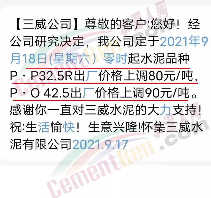 懷集三威水泥通知,9月18日零時(shí)起P.P32.5R水泥出廠價(jià)上調(diào)80元/噸,P.O42.5水泥出廠價(jià)格上調(diào)90元/噸。