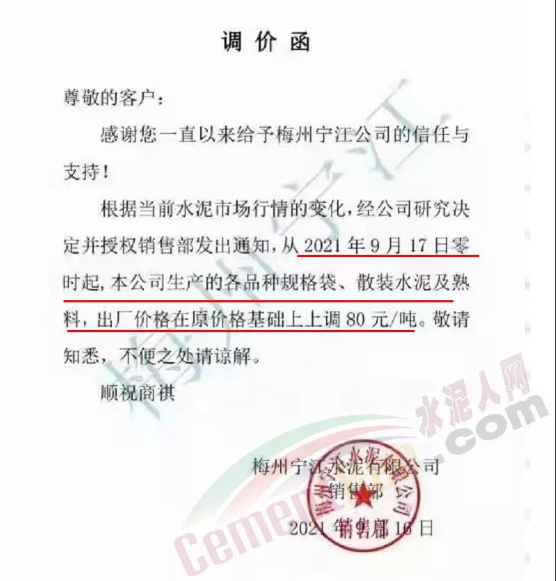 梅州寧江水泥通知自9月17日零時(shí)起,水泥價(jià)格上調(diào)80元/噸。