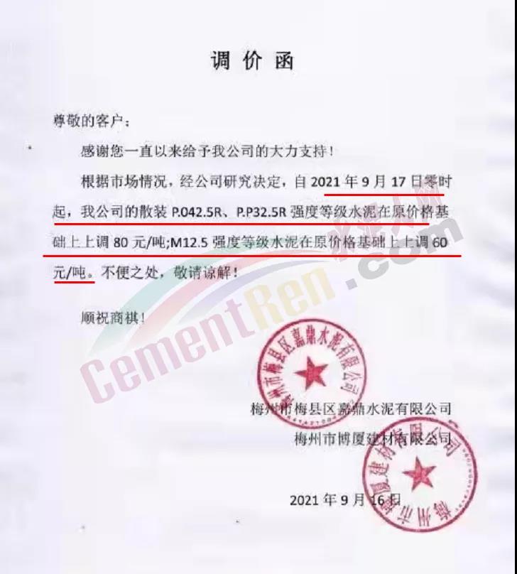 梅州市梅縣區(qū)嘉鼎水泥通知,9月17日起上調(diào)各標(biāo)號(hào)水泥80元/噸,M12.5上調(diào)60元/噸。
