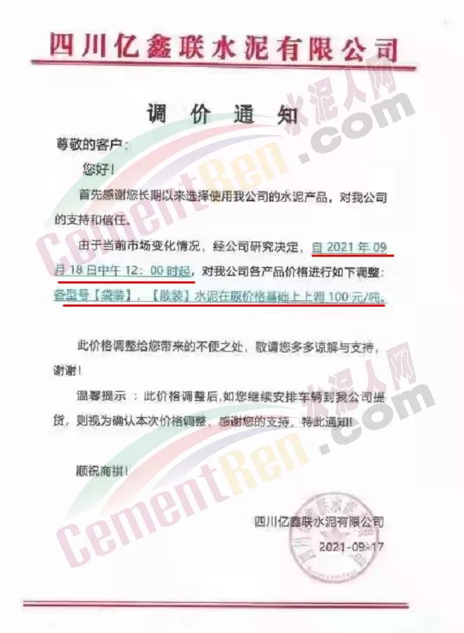 四川億鑫聯(lián)水泥通知,9月18日中午12時(shí)起,各標(biāo)號(hào)水泥上調(diào)100元/噸。