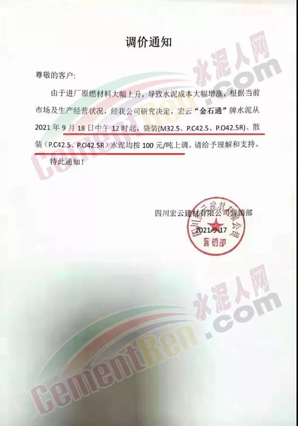 四川宏云建材有限公司通知,自9月18日中午12時(shí)起各標(biāo)號(hào)水泥上調(diào)100元/噸。