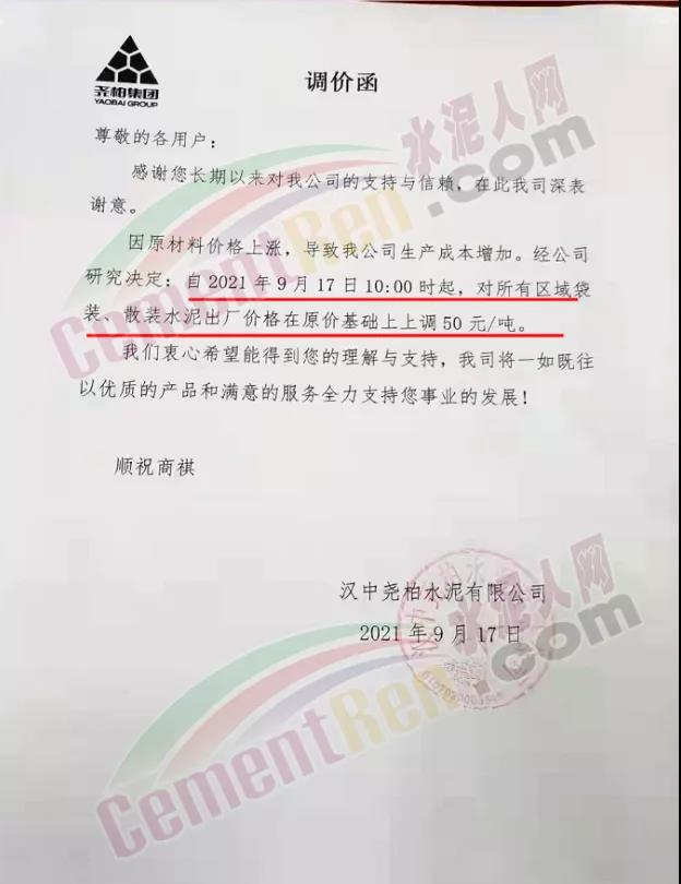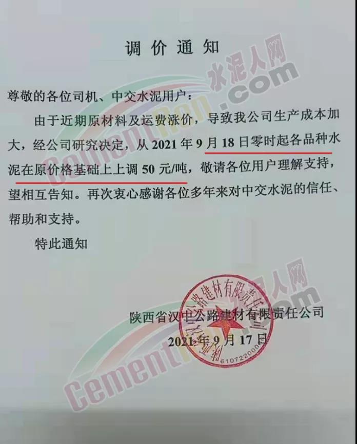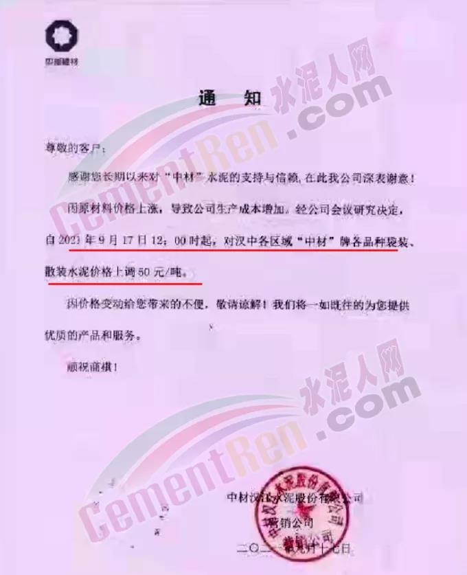 中材漢江水泥通知,自9月17日12時(shí)起對(duì)漢中各區(qū)域“中材”牌各品種水泥上調(diào)50元/噸。
