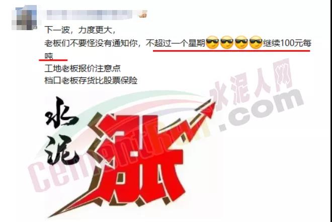 水泥銷售提示說(shuō):下一波,力度更大,老板們不要怪沒(méi)有通知你,不超過(guò)一個(gè)星期,繼續(xù)漲100元/噸。工地老板報(bào)價(jià)注意點(diǎn),檔口老板存貨比買(mǎi)股票保險(xiǎn)。